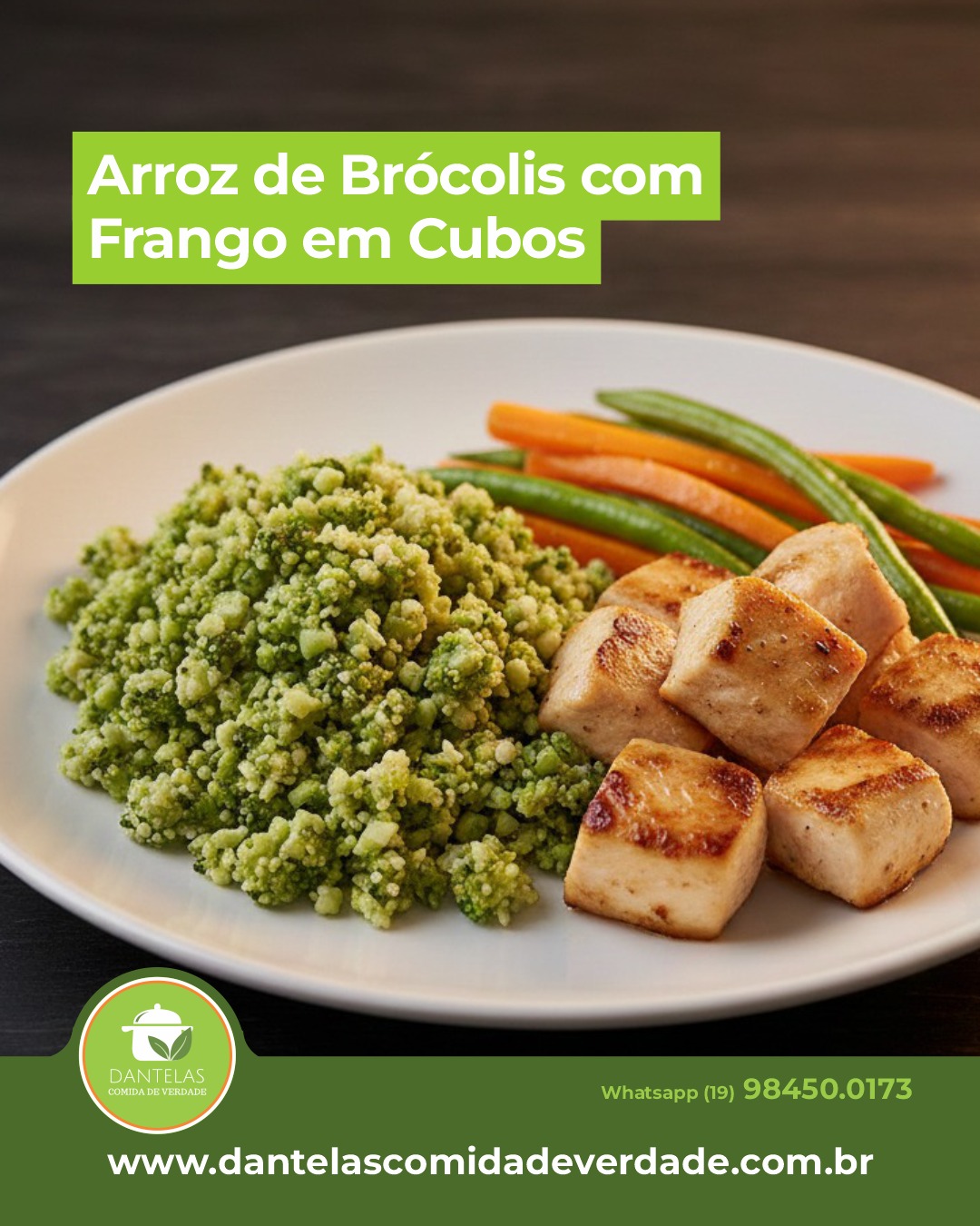 Delicioso Arroz de Brócolis(fake) com suculentos Cubos de Frango Grelhado e um mix de Cenoura e Vagem salteados na manteiga, em uma porção individual.