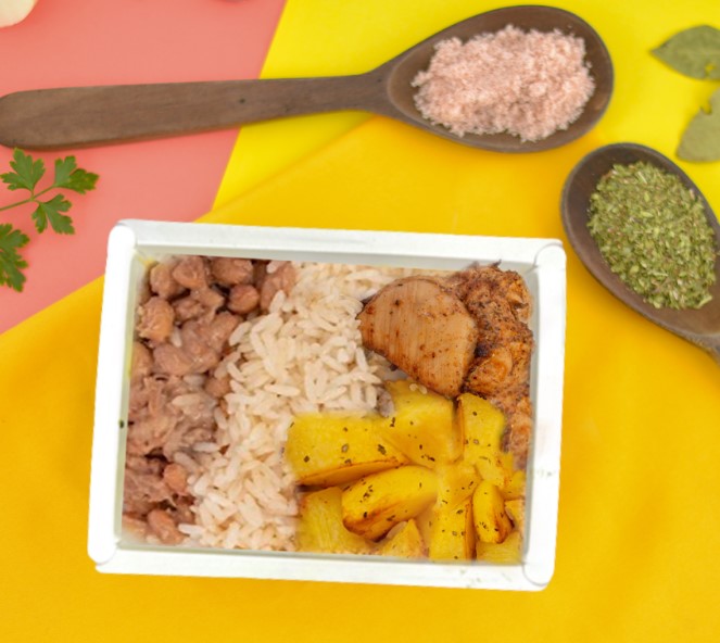 INGREDIENTES: Sobrecoxa de frango, batata, arroz, feijão, cebola, sal rosa, vinho branco, azeite de oliva extra virgem, alho, chimichurri, mostarda em pó, lemon pepper, páprica doce, folhas de louro e cúrcuma.