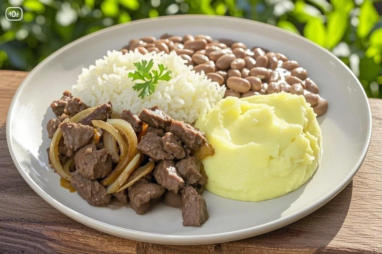 Descrição: Uma refeição que apresenta iscas de carne acebolada acompanhadas de arroz jasmim, feijão com linhaça e um purê funcional. Saboroso e nutritivo, é perfeito para um almoço completo.