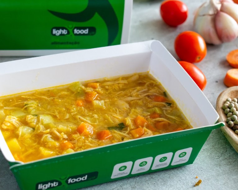 INGREDIENTES: Água, peito de frango, mandioquinha, cenoura, chuchu, abobrinha, cebola, sal rosa, alho, azeite de oliva extra virgem, chimichurri, lemon pepper, páprica doce, cúrcuma e pimenta do reino.